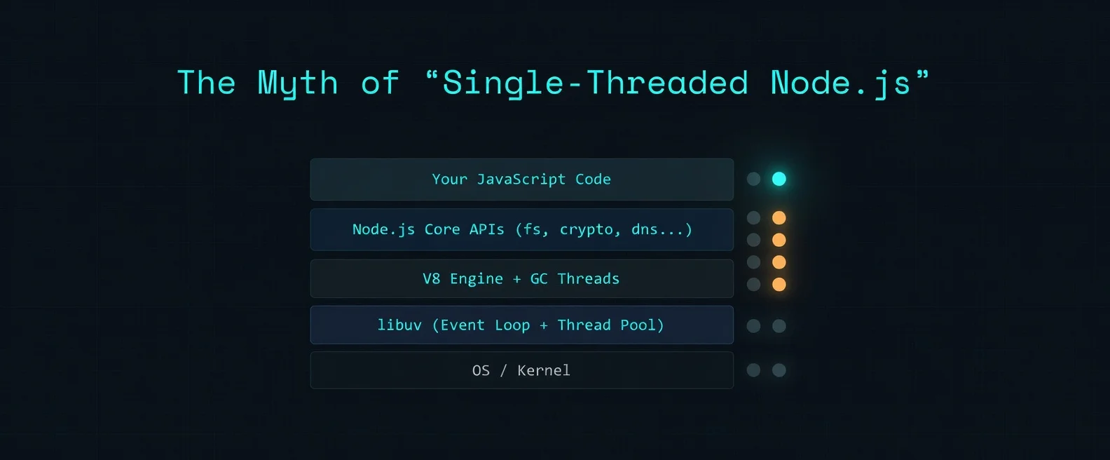 "JavaScript is single-threaded" is true. But a Node.js process is a different story. Here's what's actually running under the hood.